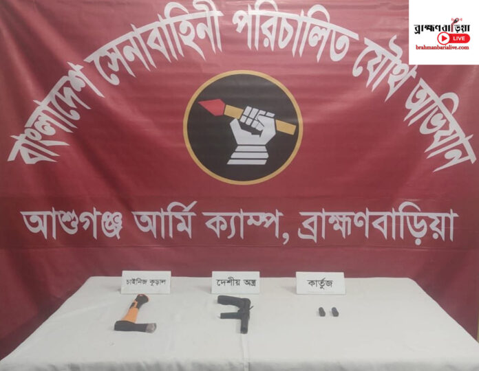 ব্রাহ্মণবাড়িয়ার আশুগঞ্জ উপজেলায় সেনাবাহিনী ও র্যাব-৯ এর যৌথ অভিযানে বিপুল পরিমাণ দেশীয় অস্ত্র ও ধারালো অস্ত্র উদ্ধার করা হয়েছে। মঙ্গলবার (২ সেপ্টেম্বর ২০২৫) রাতে দগরিসার আরাইসিধা এলাকায় চালানো এই অভিযানে একটি দেশীয় পাইপগান, দুই রাউন্ড ১২ মি.মি. কার্তুজ এবং একটি চাইনিজ কুড়াল উদ্ধার করা হয়।