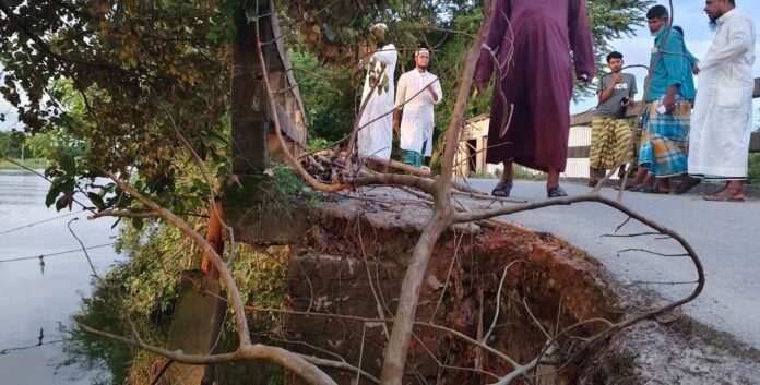 অতিবৃষ্টি ও বন্যায় ব্রাহ্মণবাড়িয়ার বাঞ্ছারামপুর উপজেলার ধারিয়ারচর থেকে মানিকপুর গ্রামের সংযোগ সড়কের একপাশ ভেঙে গেছে। রাস্তার নিচে থেকে মাটি সরে যাওয়ায় ব্রিজটির সংযোগস্থলও মারাত্মকভাবে ক্ষতিগ্রস্ত হয়েছে। ফলে এই সড়ক দিয়ে সব ধরনের যান চলাচল অত্যন্ত ঝুঁকিপূর্ণ হয়ে পড়েছে। যেকোনো মুহূর্তে বড় ধরনের দুর্ঘটনা ঘটার আশঙ্কা করছেন স্থানীয়রা।