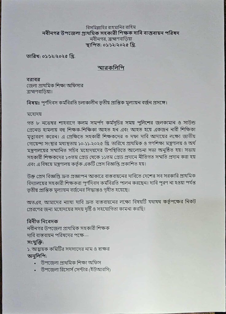 নবীনগরে সহকারী শিক্ষকদের ২৯ সদস্যের আহ্বায়ক কমিটি গঠন: কর্মবিরতি ও তৃতীয় প্রান্তিক মূল্যায়ন বর্জনের ঘোষণা