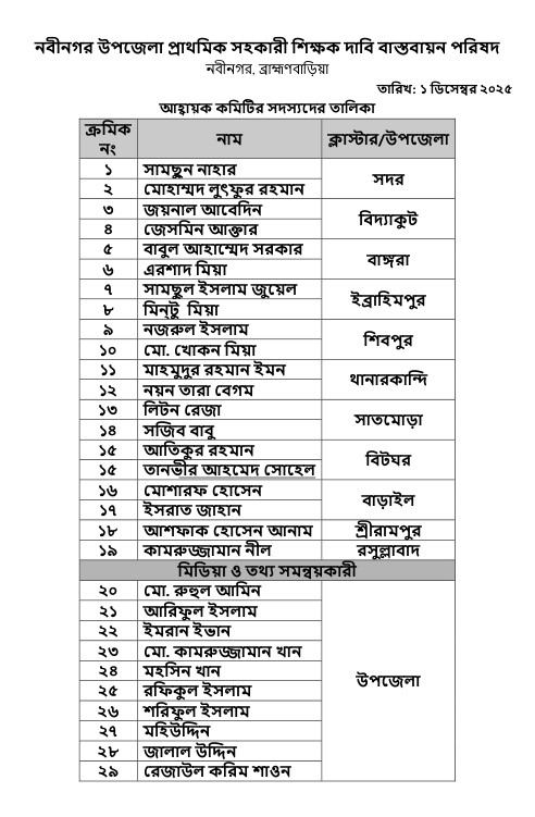 সহকারী শিক্ষকদের তিন দফা ন্যায্য দাবি আদায়ের জাতীয় কর্মসূচির অংশ হিসেবে নবীনগর উপজেলায় ২৯ সদস্য বিশিষ্ট আহ্বায়ক কমিটি গঠন করা হয়েছে। কার্যক্রমকে সুসংগঠিত করতে উপজেলার মোট ১১টি ক্লাস্টার ভিত্তিক প্রতিনিধি মনোনীত করা হয়েছে। পাশাপাশি আন্দোলন-সংক্রান্ত তথ্য সংগ্রহ, সংবাদ পরিবেশন এবং গণমাধ্যমে যোগাযোগ জোরদার করতে মিডিয়া ও তথ্য-সমন্বয় উপকমিটিতে অতিরিক্ত ১০ জনকে অন্তর্ভুক্ত করা হয়েছে।