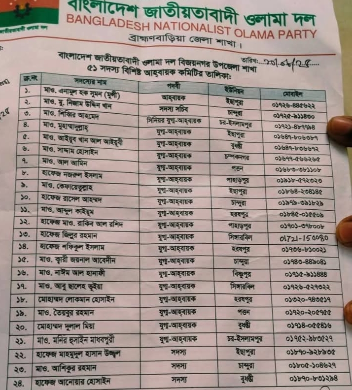 বাংলাদেশ জাতীয়তাবাদী ওলামা দলের ব্রাহ্মণবাড়িয়া জেলা শাখার উদ্যোগে বিজয়নগর উপজেলা শাখার একটি নতুন আহ্বায়ক কমিটি গঠিত হয়েছে। ৫১ সদস্য বিশিষ্ট এই কমিটিতে সভাপতি হিসেবে মনোনীত হয়েছেন মাও. এনামুল হক সুমন (মুন্সী), সদস্য সচিব মাও. মু. নিজাম উদ্দিন খান, এবং সিনিয়র যুগ্ম-আহ্বায়ক হিসেবে রয়েছেন মাও. শিব্বির আহমেদ