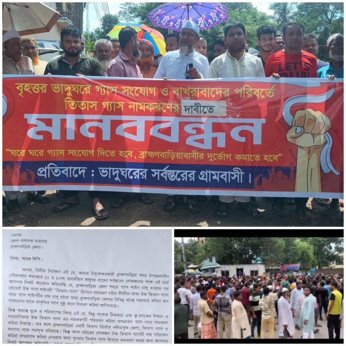 ​স্মারকলিপিতে বলা হয়েছে, ব্রাহ্মণবাড়িয়া শহরে গ্যাস লাইন চালুর পর থেকেই ভাদুঘর গ্রামে ‘তিতাস গ্যাস’ নামে একটি লাইন থেকে গ্যাস সংযোগ দেওয়া হয়েছিল। এই লাইনের মাধ্যমে অনেকেই গ্যাস ব্যবহার করে আসছিলেন। কিন্তু দুঃখের বিষয়, কিছু অসাধু ব্যক্তি স্বার্থান্বেষী মহলের ইন্ধনে এই লাইনের নাম পরিবর্তন করে ‘বাখরাবাদ গ্যাস’ নামে নামকরণ করে দিয়েছে। এর ফলে সাধারণ জনগণের মধ্যে চরম ক্ষোভের সৃষ্টি হয়েছে।